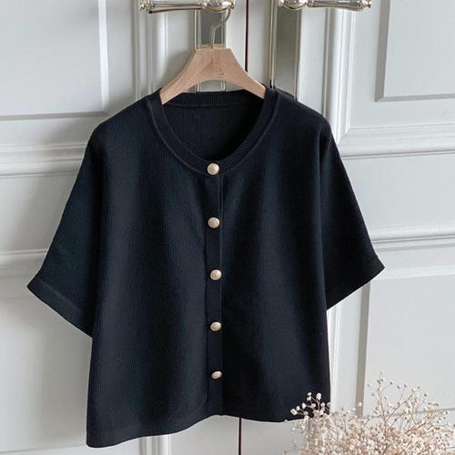 여성 라운드넥 금장 단추 가오리핏 반팔 니트 가디건 DGB-WCD-4738-블랙