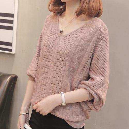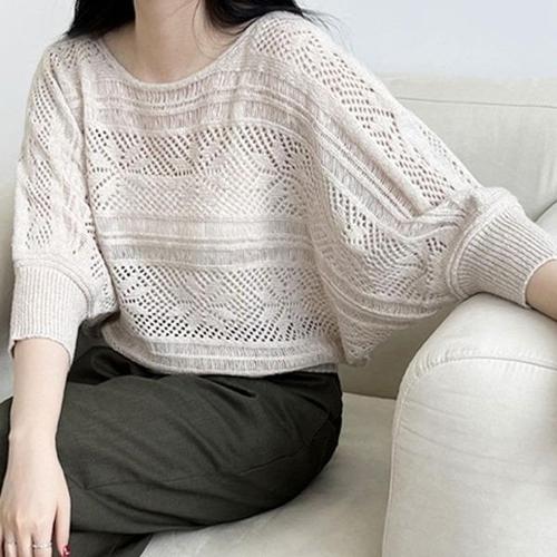 ROYALBELLE 여성 디자인 가오리소매 스웨터 언밸런스 단색 우아한 캐주얼 나른한 니트티 D0112017