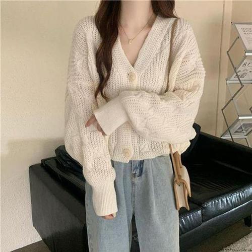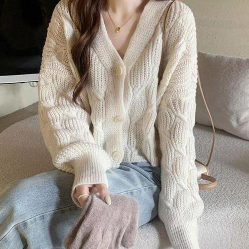 [셀러허브_여성트랜드패션]여자 크롭 가오리핏 니트 긴팔 꽈배기 가디건 브이넥
