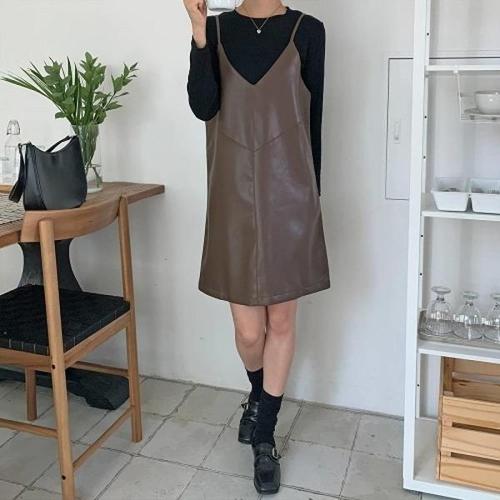 [다잇템][다잇템] 여자 가을뷔스티에 타이트 모조가죽 드레스 에이라인 세트_18930477_588872