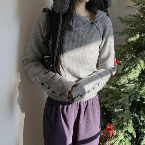[옷자락]여자 가을겨울 사선넥 버튼 후드 니트
