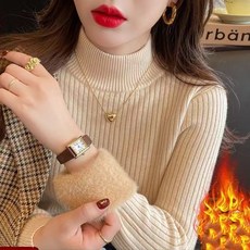여성용 가을 겨울 반폴라 세로 스트라이프 니트티 슬림핏 긴팔 기모 스웨터