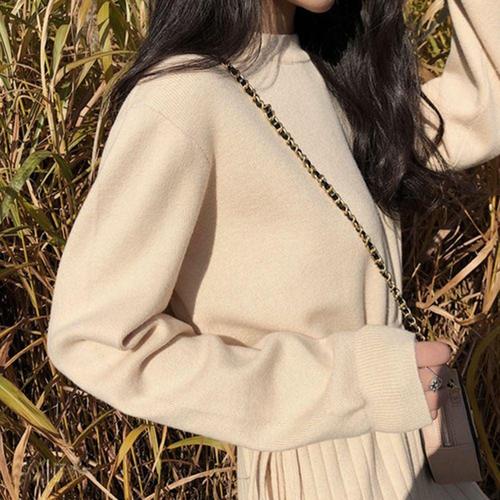 ANYOU 여성 가을 골지 니트 원피스 플리츠 주름 긴팔 롱원피스