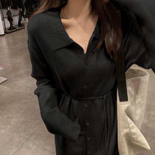 니트 가을 원피스 단추 카라 루즈핏 허리끈 롱 WEE9165