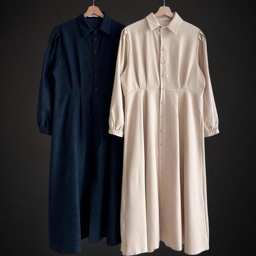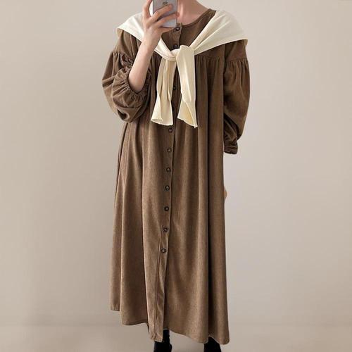 [미라클세븐]여성 코듀로이 셔링 롱 원피스 버튼 퍼프 빅사이즈 가을용