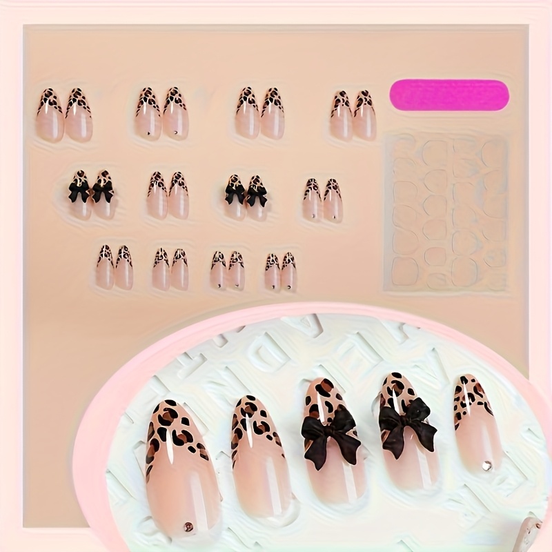 TEMU 24개입 프린트 프렌치 매니큐어 프레스 네일 - 블랙 리본 장식, 아몬드형 중간길이 탈부착 네일아트, 광택 & 리본, 파티, 웨딩, 데일리웨어용