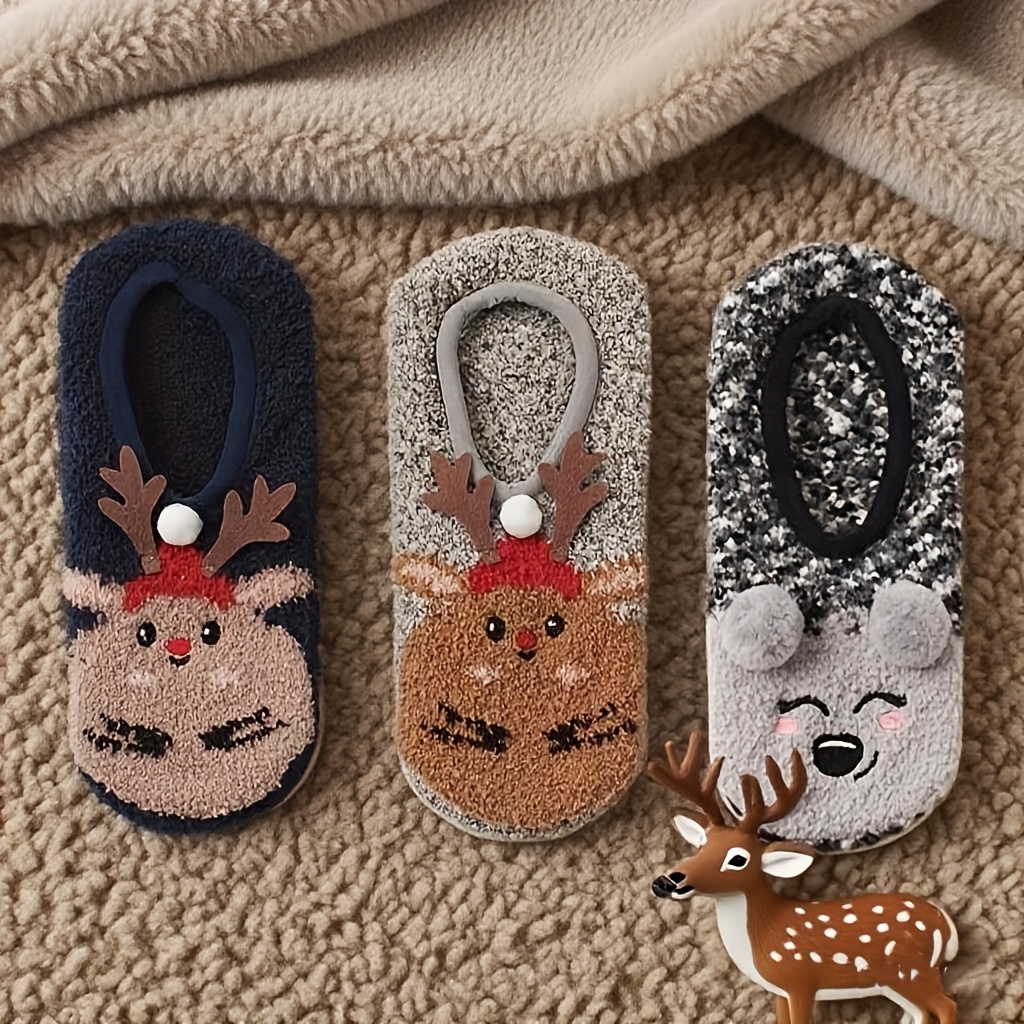 TEMU 3켤레 여성용 크리스마스 사슴 슬리퍼 - 두꺼운 겨울 따뜻함, 귀여운 사슴 & 산타 모자 디자인, 부드러운 플러시 & 튼튼한 원단, 세탁기 사용 가능, 집, 요가 또는 아늑한 라운지에 완벽한 휴일 선물, 크리스마스 슬리퍼, 축제 분위기 신발