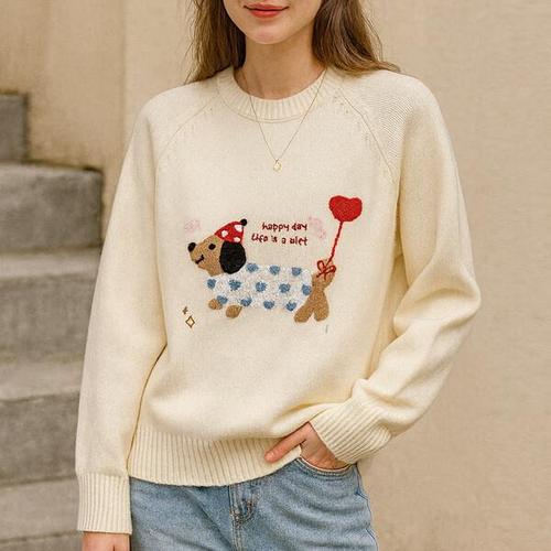 [신상오픈런]여성용 귀여운 강아지 자수 라운드 니트 가을 울 스웨터