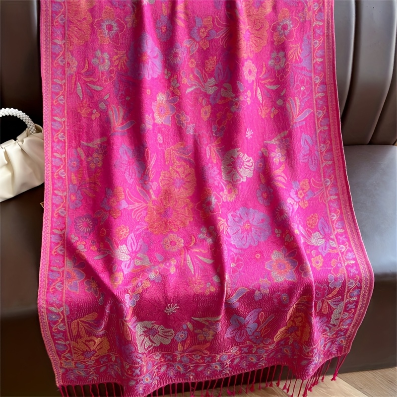 TEMU 여성용 플로랄 자카드 숄 1개 - 생동감 있는 핑크, 오렌지 & 블루 프린트가 있는 부드러운 폴리에스터 긴 스카프, 캐주얼 외출 및 데이트, 겨울 따뜻함에 완벽함