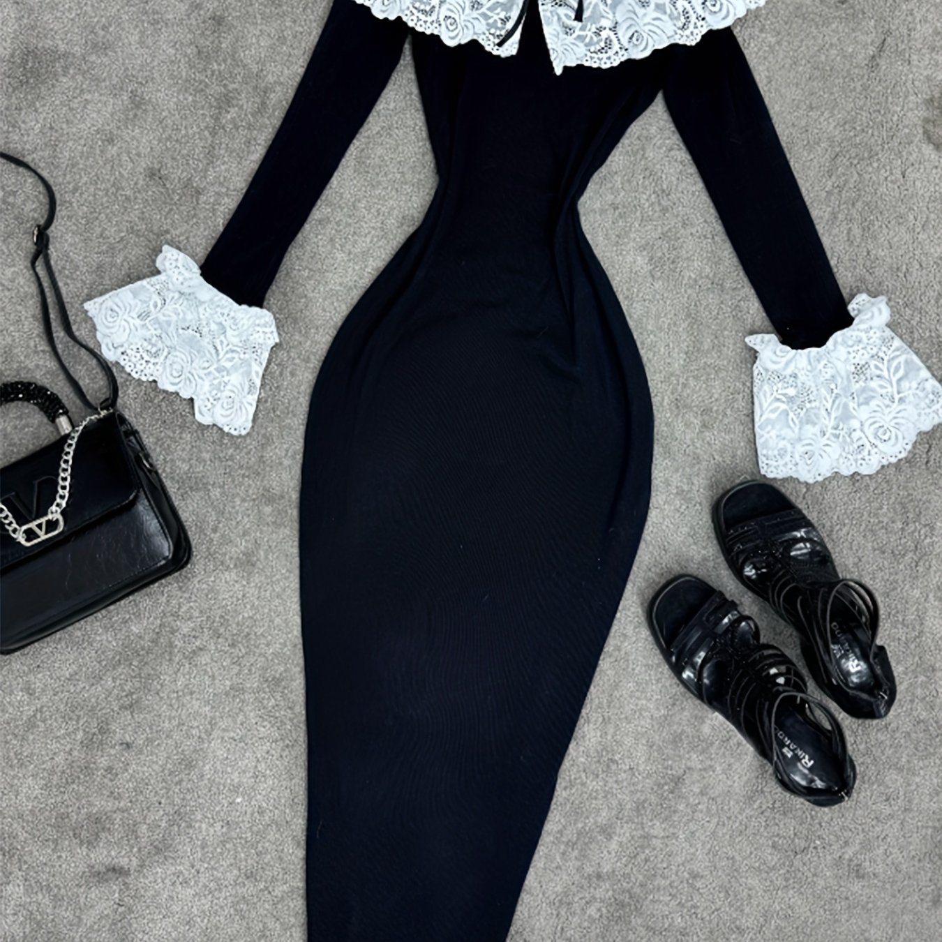 TEMU 여성용 우아한 레이스 패널 머메이드 드레스 - 긴 소매 A라인 포멀 파티 웨딩 게스트 드레스, 짧은 트레인 밑단, 세탁기 사용 가능 블랙 & 레이스 사계절 저녁 가운
