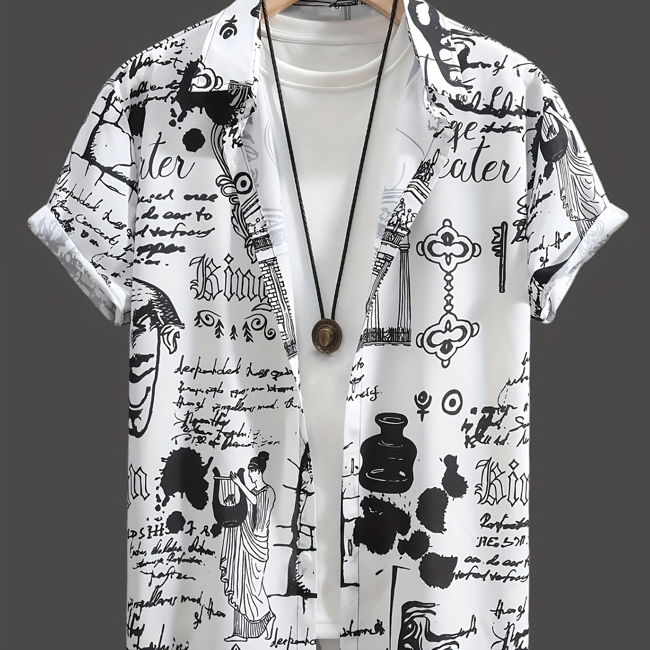 TEMU 남성용 레트로 문자 및 패턴 프린트 반팔 래펠 셔츠 상의, 남성 캐주얼 버튼업 셔츠 일상 및 휴가 리조트 해변용