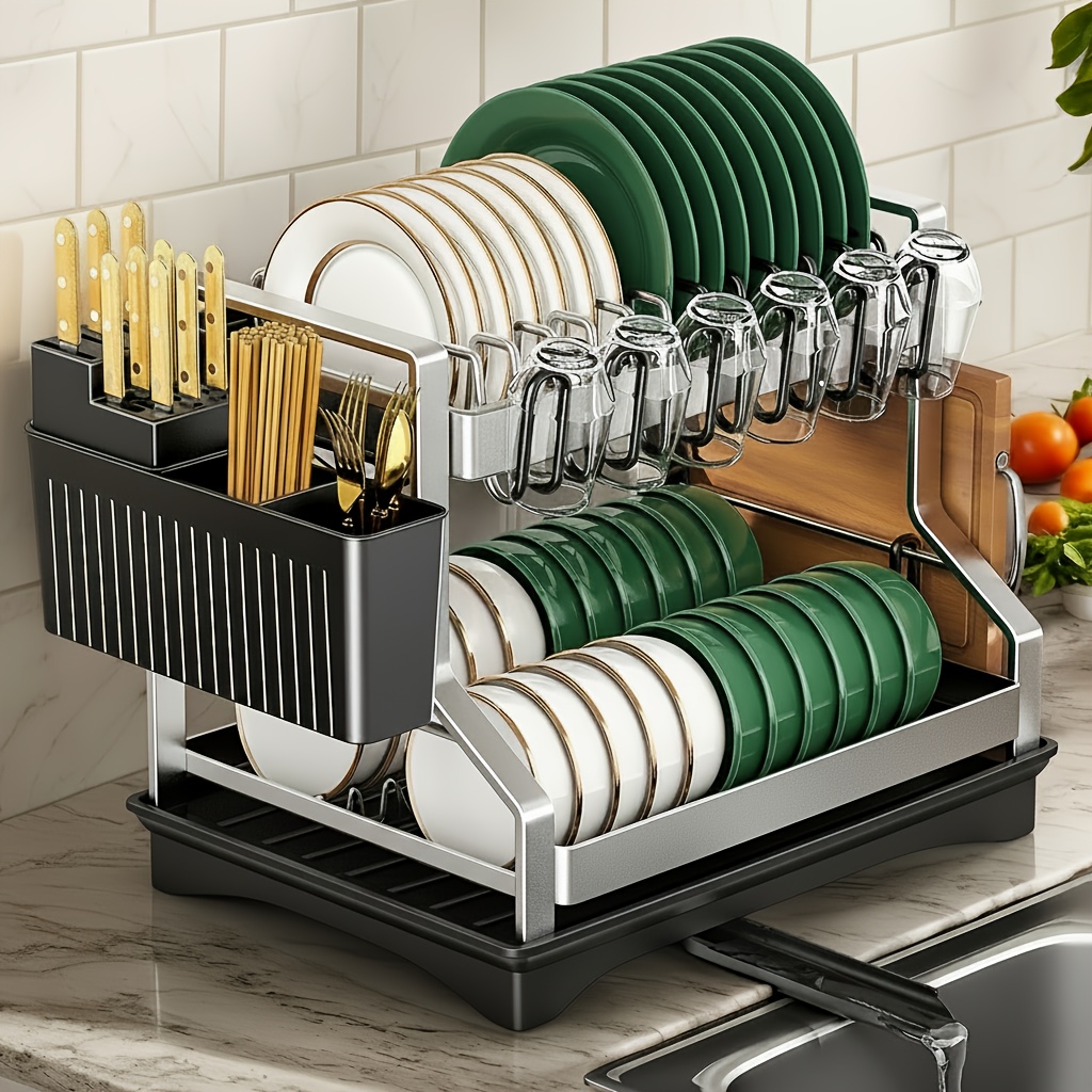TEMU 다용도 블랙 더블 레이어 식기 건조대와 배수 트레이 및 드립 팬, 주방 액세서리 세트 (칼 포크 스탠드, 도마 거치대, 젓가락 홀더 포함), 카운터탑에 적합|식기건조대