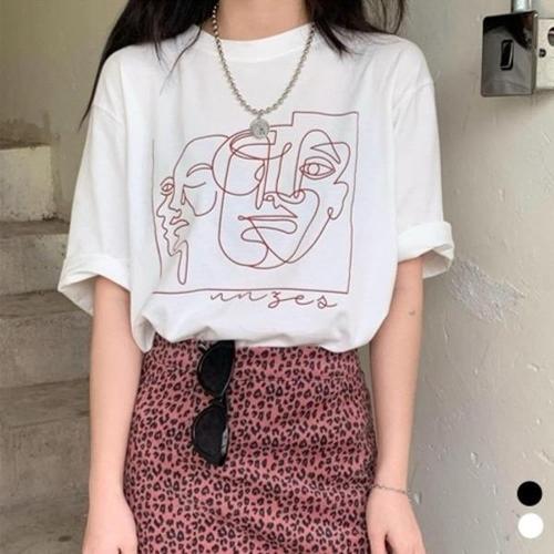 [다잇템]여자 프린팅 흰색 검정 빅사이즈 나염 반팔티