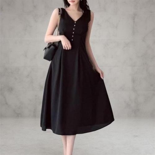 [다잇템][다잇템] 여성 진주버튼 검정 그런지 슬리브리스 V넥 롱 드레스_23740396_588872