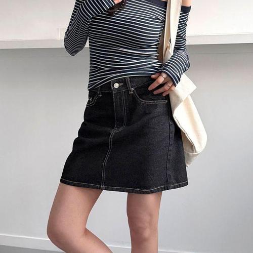 [다잇템]여성 검정 자수 에이라인 진 코튼 미니스커트
