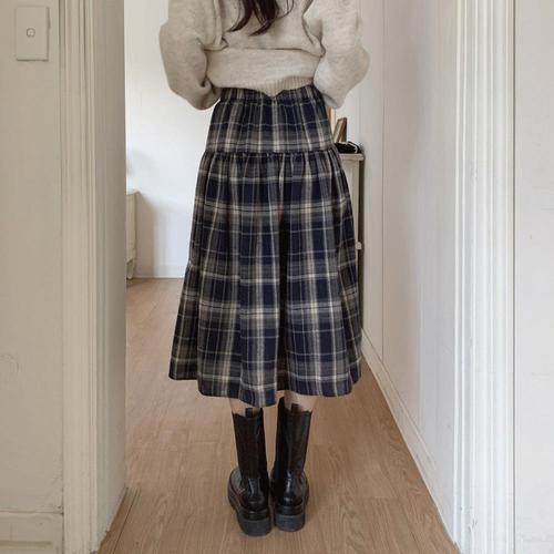 스테디 A핏 그리드패턴 스커트 블루검정 주름 플레어핏 롱스커트