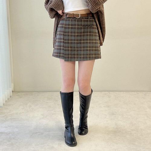 [옷자락]여자 연말룩 체크 랩 겨울반바지 A라인 벨트 치마바지
