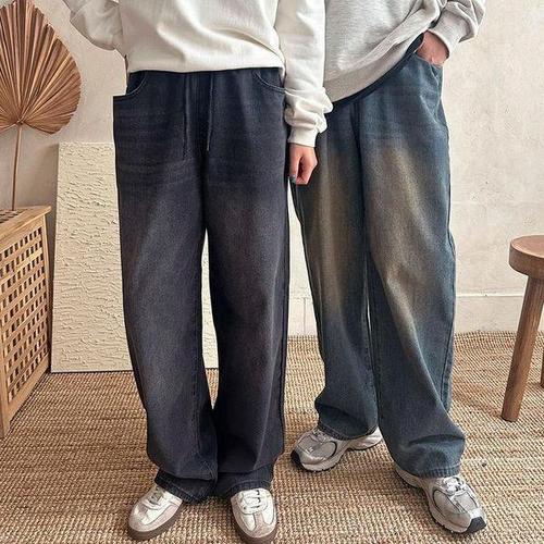 [다잇템][다잇템] 여자 워싱 콘트라스트 넓은 고무줄 남자 커플데님팬츠 청바지_23103579_588872