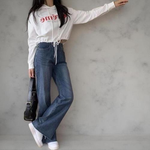 [다잇템]여자 사선 와이드핏 컷아웃 나팔 고무줄 청바지
