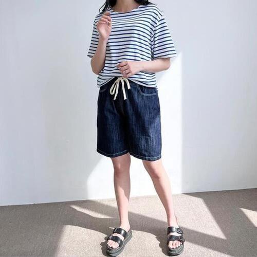 [다잇템]여자 고무줄 파란색 진청 하프팬츠 넓은 반바지 (10630594A)