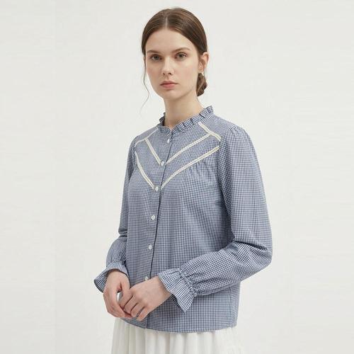 [샵앤]여성 프릴 라운드넥 고방체크 긴팔 블라우스 MSE-WBL-21132-네이비