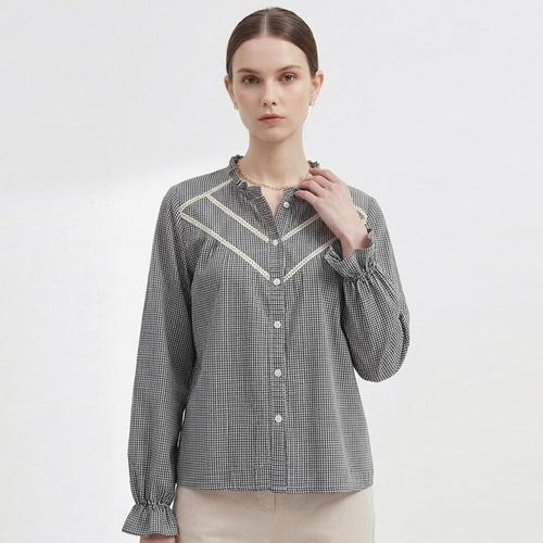 [샵앤]여성 프릴 라운드넥 고방체크 긴팔 블라우스 MSE-WBL-21132-블랙