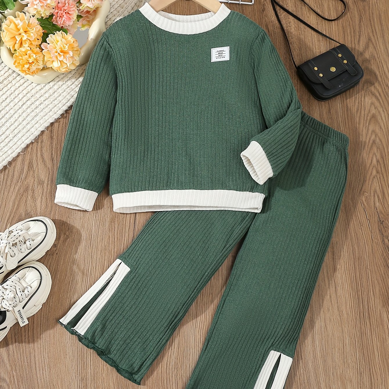 TEMU 여아용 롱팬츠 세트, 라운드넥 기본 긴팔 컬러 블록 티셔츠 상의 & 슬릿 헴 레그 팬츠, 캐주얼 외출에 적합, 야외, 일상 및 캐주얼 복장에 완벽, 여아용 캐주얼 복장, 야외용