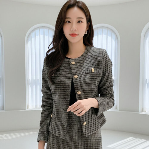 스타일라떼 / 골드버튼 울 체크 노카라 라운드넥 자켓 여성 겨울 아우터 싱글 정장 자켓