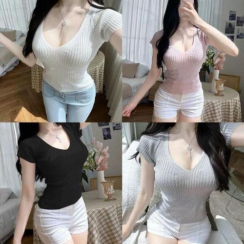 [에이치플러스몰]소프너리티 골지 니트 데일리 무지 반팔 글램 슬림 V넥