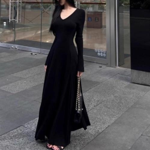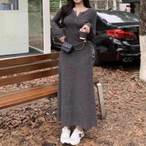 여자 봄 가을 겨울 무지 브이넥 골지 롱 원피스 모임룩 하객룩