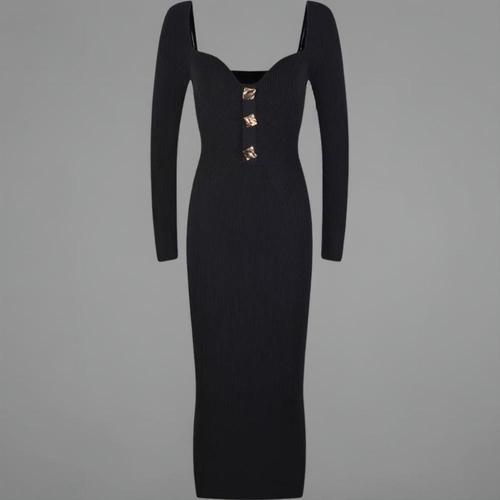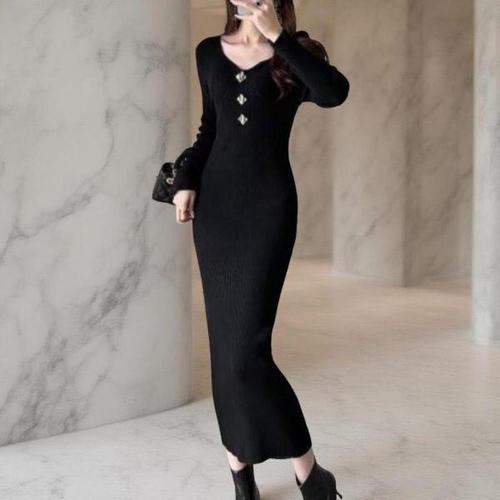 [신상오픈런]여성용 하트넥 골드버튼 롱 원피스 슬림핏 골지 니트 드레스