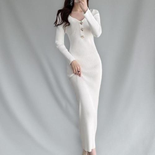 [옷자락]여성 슬림핏 골지 골드버튼 하트넥 롱 니트 원피스