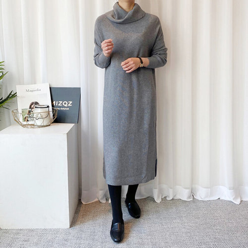 미즈큐즈 / 빅 터틀넥 목폴라 골지 옆트임 루즈핏 니트 롱 원피스