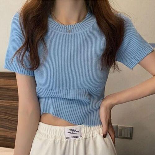 [에이치플러스몰]여자 여름 니트 반팔 블루 라운드넥 골지 슬림 니트티