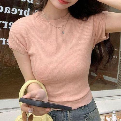 [에이치플러스몰]여성 반팔 크롭니트 얇은 꼬임 골지 이너 티셔츠