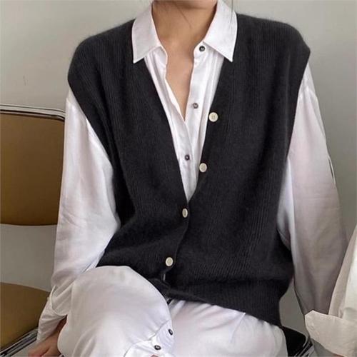 [다잇템]여자 단추 골지 V넥 회색 데일리 니트조끼 (9677281A)
