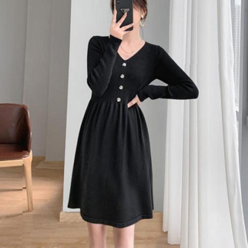 여성 하객룩 고급 골지 단추 미니 니트 블랙 원피스 WFL1KIA