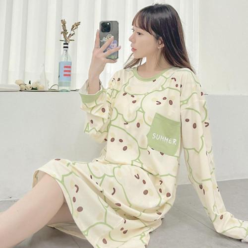 여성 원피스 잠옷 곰 사방 스판 롱원피스 오버핏 빅사이즈 봄 주니어 학생 실내복 홈웨어 파자마