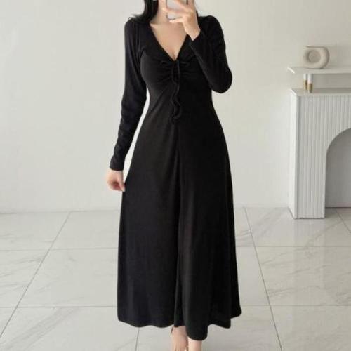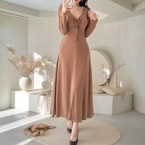 [다잇템_패션]여자 스웨터 롱 잔주름 V넥 귀여운 원피스