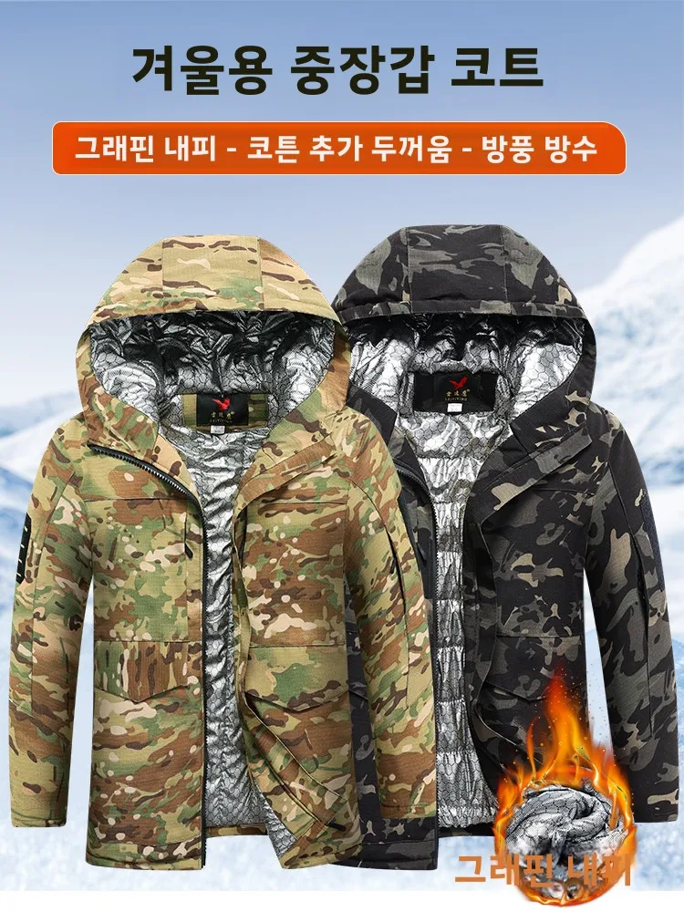 남성용 그래핀 위장 무늬 코튼 재킷 겨울 두꺼운 방수 따뜻한 작업복 후드 폴리에스터 섬유 혼방 청년 패션