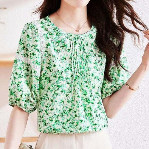 ( )여름블라우스 여성 여름 꽃무늬 플라워 반팔 블라우스 그린 반팔블라우스