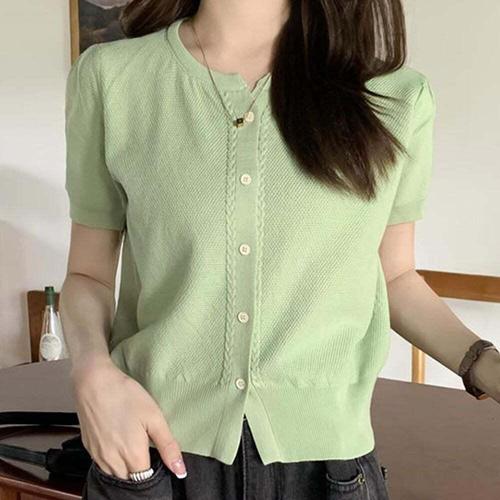 [셀럽하우스]그린 TFFI4714 크롭 반팔 니트 앞단추 오픈 클로징 여름 가디건