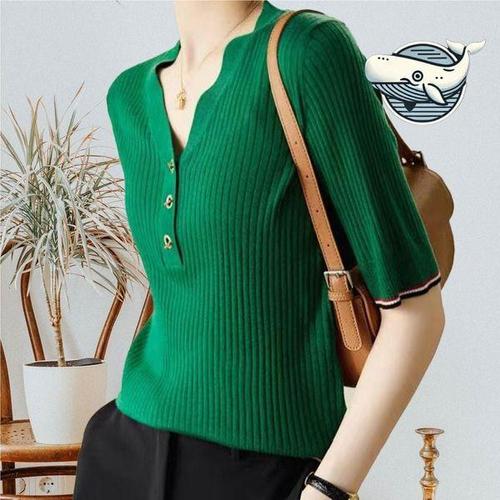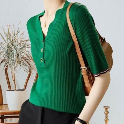 [엄지척]여성 여름 골지 브이넥 반팔 니트 티셔츠 그린_19678484_667501