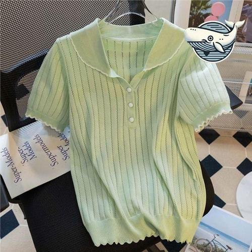 [에이치플러스몰]여성용 여름 반팔 니트 티셔츠 그린 펀칭 배색
