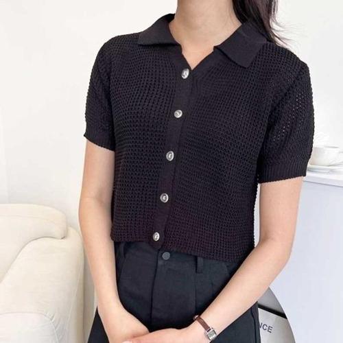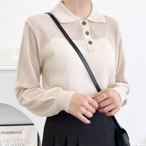 여성 시스루 그물 반팔 니트 티 2color 카라 티셔츠 단추 데일리 러블리 (WFJF9QH)