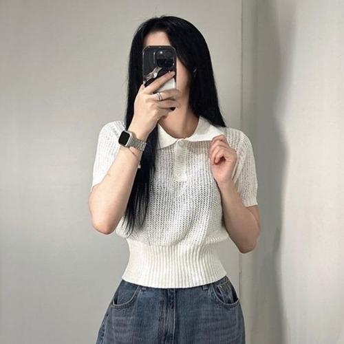 [엄지척]여성 시스루 그물 반팔 니트 티 2color/카라 티셔츠_19678375_667501