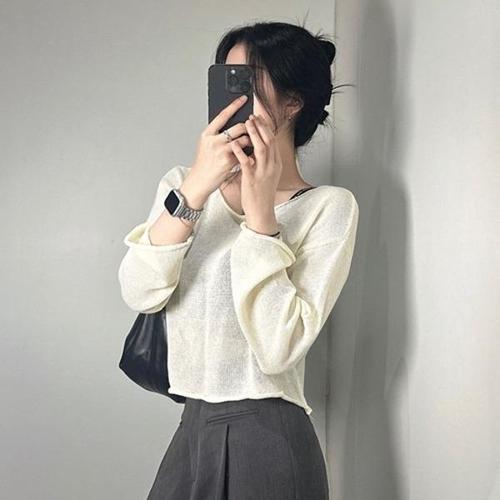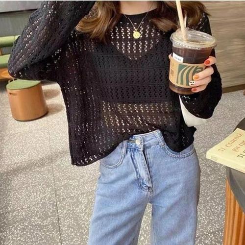 [엄지척]여자 크롭 긴팔 여름 그물 망사니트 라운드넥 시스루_19680155_667501