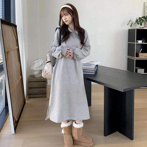 [옷자락]여성 심플 카라넥 기모 안감 오버핏 롱 원피스