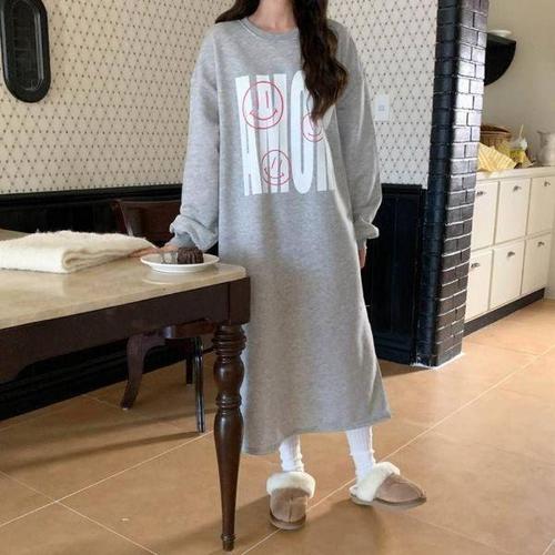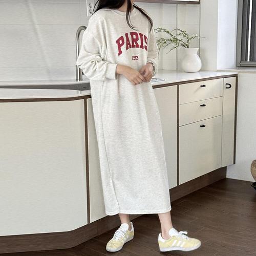 [유야]여성 기모 레터링 면 라운드 긴팔 롱 원피스 -FOP0569- 겨울