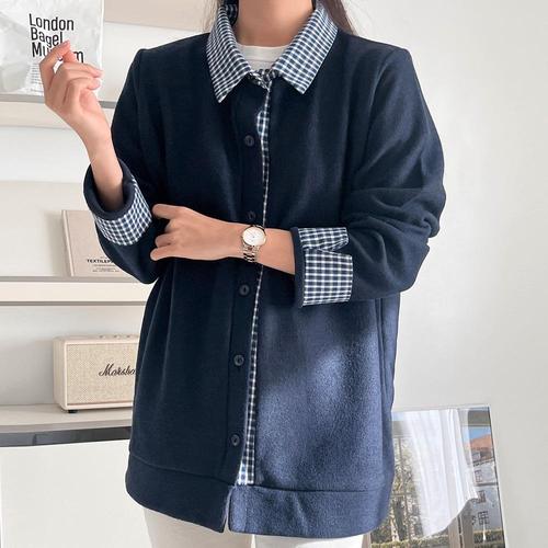[옷자락] 여자 기모 체크셔츠 레이어드 빅사이즈 네이비 가디건